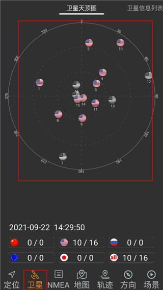 - 直观显示当前卫星信号接收状态,支持北斗、GPS、GLONASS、伽利略等多个卫星导航系统;