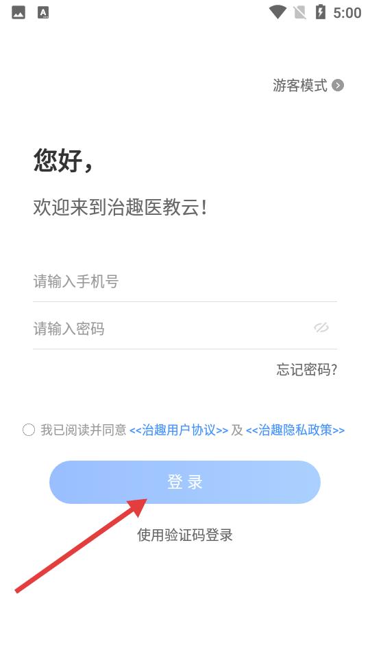 1、点击登录页,可通过手机号、密码或验证码登录,设有游客模式需阅读同意协议政策方可登录。