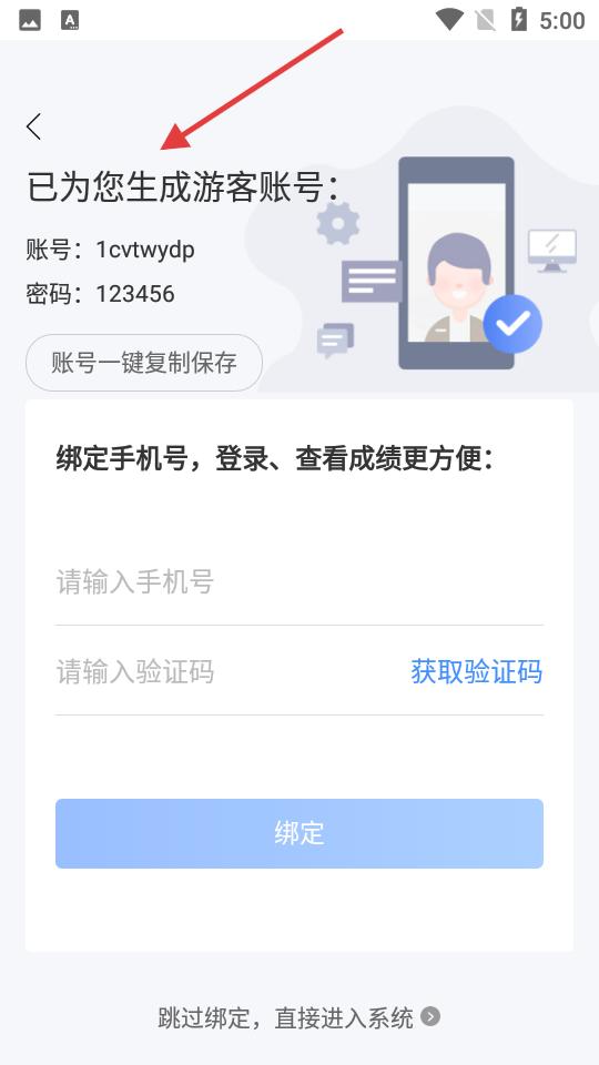 2、点击游客模式界面,系统自动生成账号1cvtwydp与密码123456,可选择绑定手机号,也能跳过直接进系统。
