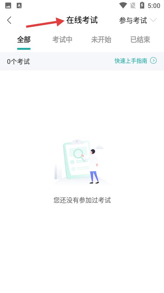 3、在线考试页面,含全部、考试中等考试状态分类,目前无考试记录,有快速上手指南供用户参考。