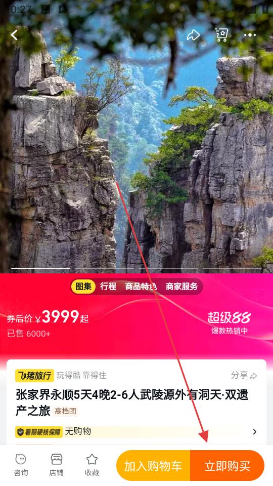 3、在产品详情页,确认行程内容后,点击立即购买按钮,按提示填写信息、完成支付,预订该旅游产品。