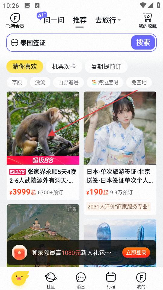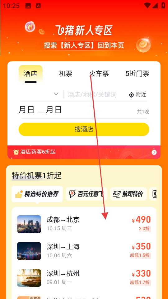 1、打开飞猪APP,进入首页可在新人专区选择酒店机票等服务,也可切换至推荐页面,浏览猜你喜欢的旅游产品。