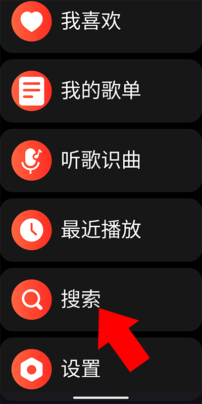 1、打开网易云音乐手表版并点击右上角的三条杠符号进入菜单界面后,往下滑找到搜索按钮