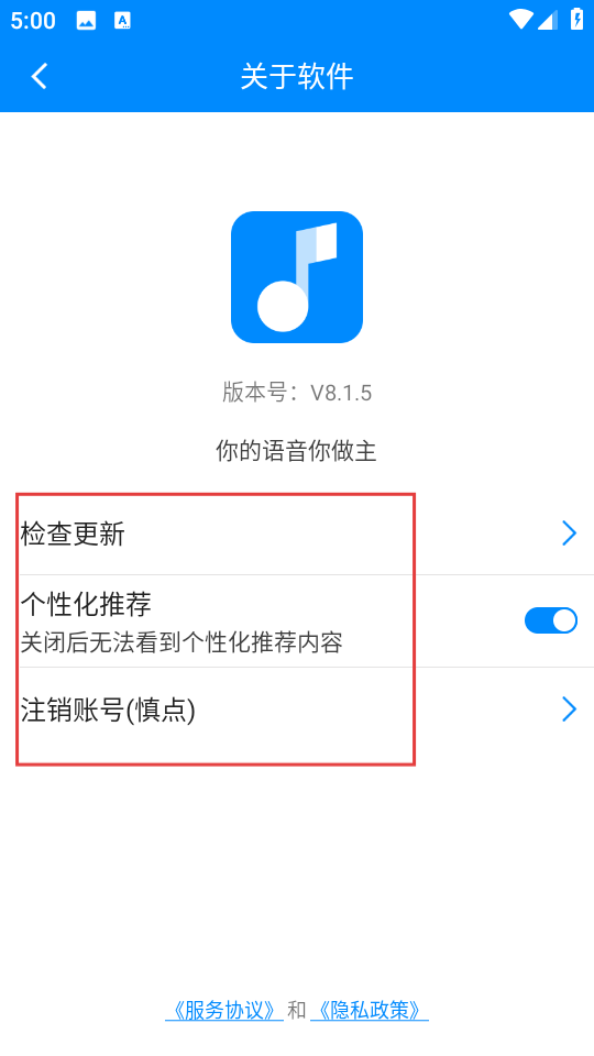 3、进入关于软件页面有实用设置,有检查更新、个性化推荐、注销账号功能,用户按需操作这些选项,能让软件更贴合个人使用习惯,优化用户的使用体验。