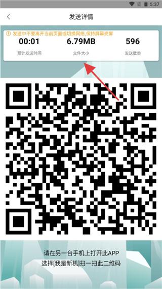 3、发送详情页显示传输文件的预计时间、大小等,生成专属二维码,另一台手机选我是新机扫码,即可接收数据,完成迁移。