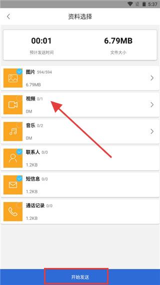 2、进入资料选择页,可勾选图片、视频等各类数据,选好后点开始发送,就能将选中资料传输至目标设备,操作清晰简便。