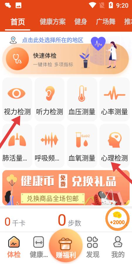 1、健康首页功能丰富视力听力血压等检测入口清晰,快速体检一键启动,心理检测模块显眼,帮助用户便捷监测多项健康指标,开启健康管理第一步。