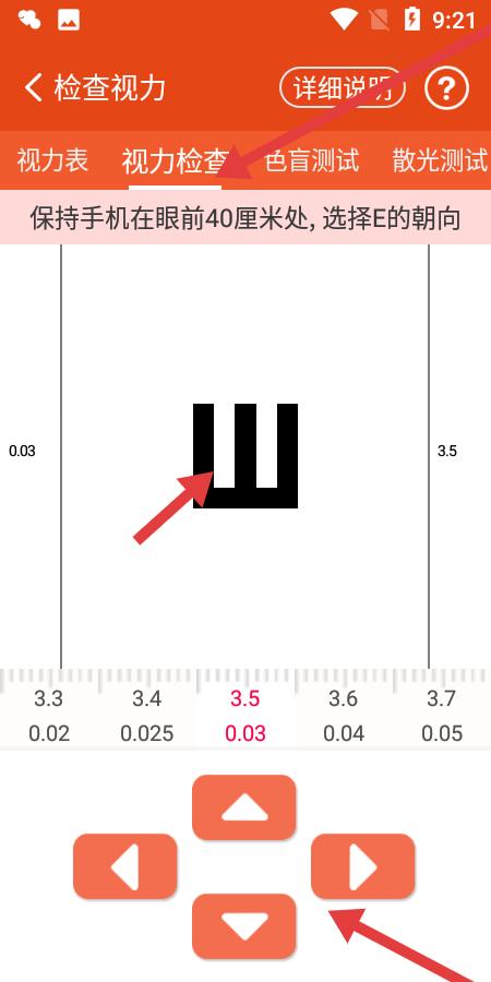 2、视力检测界面专业视力表展示清晰,操作按钮直观,提示保持距离选择E的朝向,辅助用户自助完成视力检查,轻松了解视力状况。