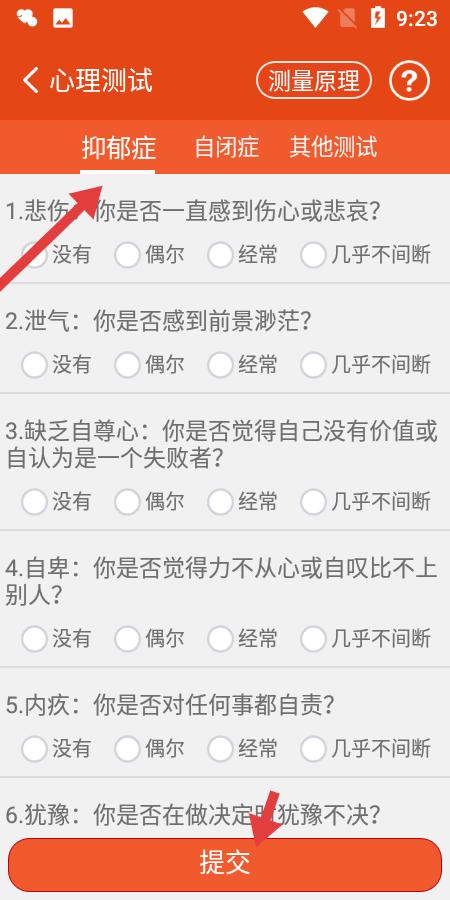 3、心理测试板块细致抑郁症等分类明确,测试题目围绕情绪状态设计,选项涵盖不同频率,提交按钮便捷,助力用户评估心理状态,关注心理健康。