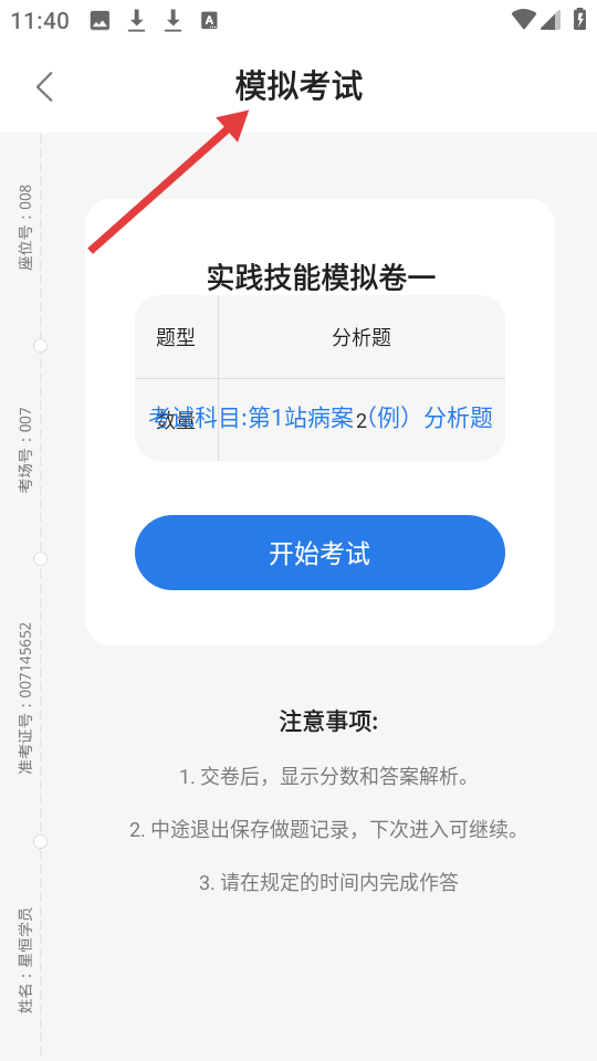 3、模拟考试页面呈现实践技能模拟卷一,题型为分析题,有开始考试按钮下方是考试注意事项说明。