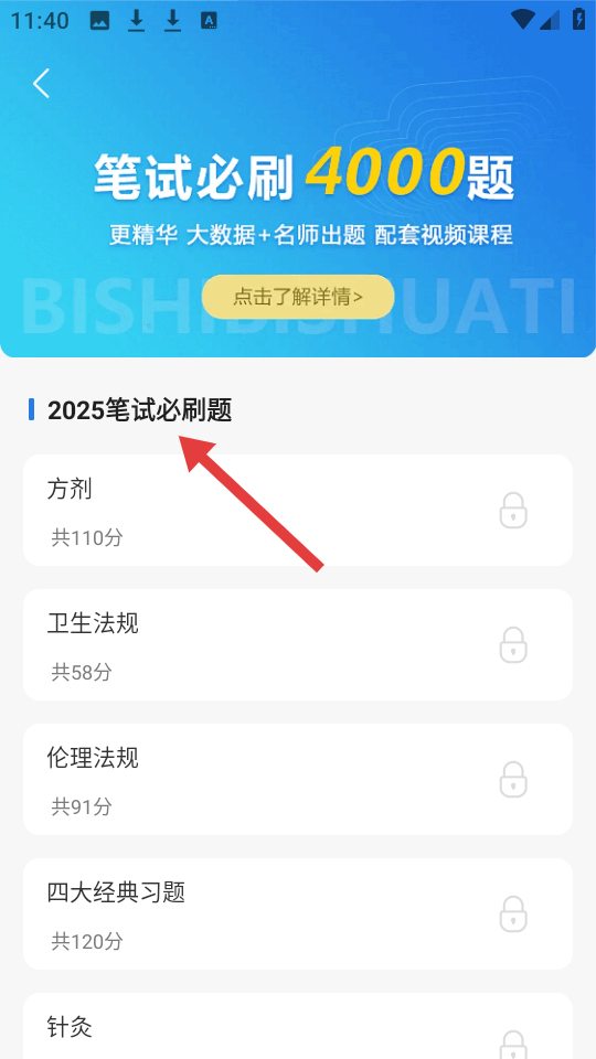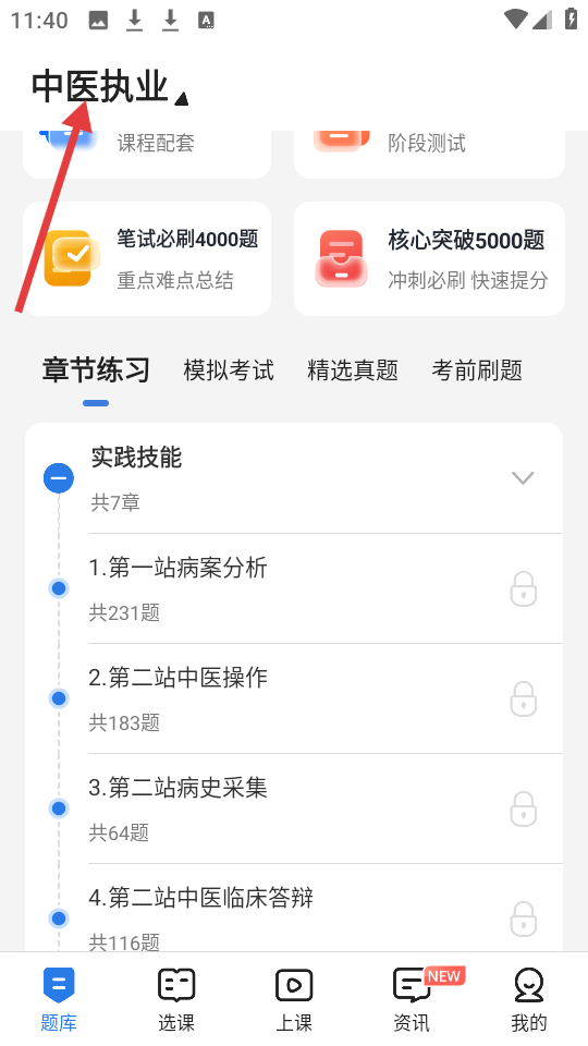 4、中医执业主界面的题库部分,有课程配套、阶段测试等,章节练习下细分实践技能各站题目数量部分内容锁定。