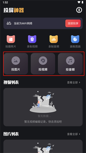 4、成功连接后,选择你需要投屏的功能,例如图片、视频、音频等;