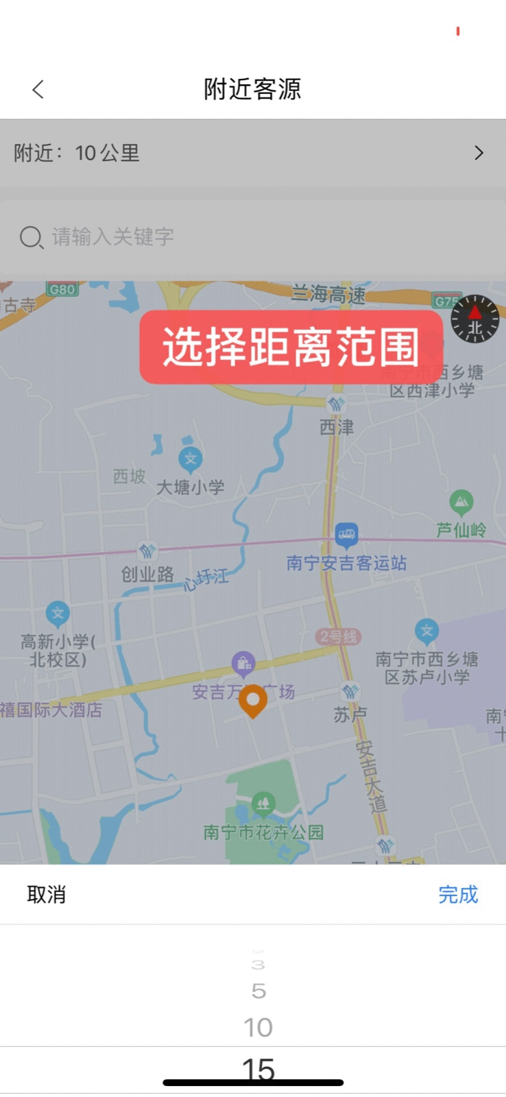打开【附近客源】-设置范围-输入查到的关键-点击开始查询。