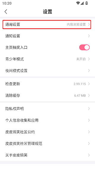 2、进入皮皮搞笑APP的设置界面后,点击通用设置会跳转至更细分的功能调节页面,这里涵盖了缓存清理、字体大小调整、主题模式切换等基础功能。