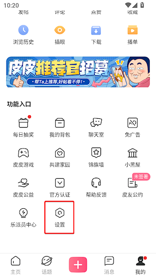 1、先在手机桌面找到皮皮搞笑APP图标点击打开,进入APP后切换到我的界面,这里能看到自己的收藏、创作等内容,点击设置选项就能进入设置页面。