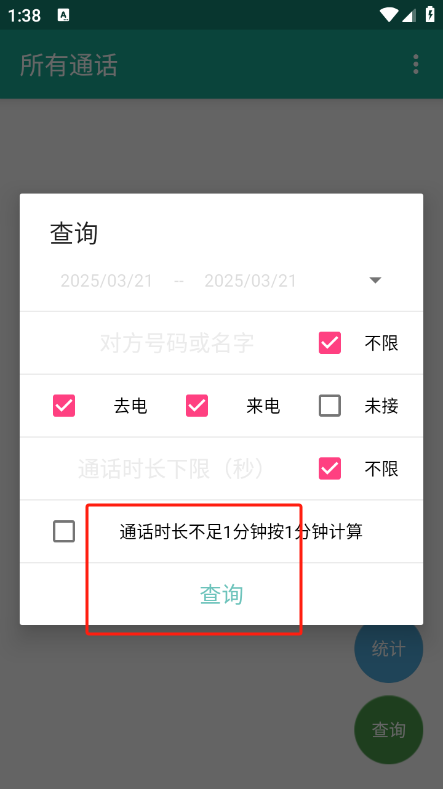 使用所有通话,您可以根据通话时间、通话对象、通话类型以及通话时长等多个条件组合查询通话记录,并且可以对查询结果进行统计。