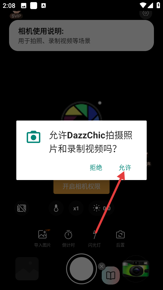 1、打开Dazz相机免费版,首先会弹出相机权限请求框,询问是否允许DazzChic拍摄照片和录制视频,为正常使用拍摄功能点击允许按钮,只有授予权限才能进入相机主界面。