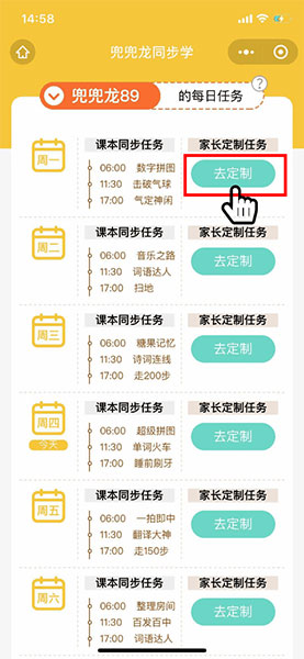 3、在微信中关注公众号后,可以点击公众号的[定制任务]菜单栏为孩子定制每日任务
