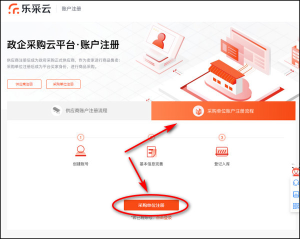 3、进去就是账号注册界面,点一下右边的采购单位注册可以稍微看下流程,然后点下面的注册吧。