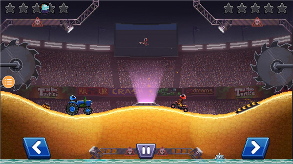 4、像这样在高塔上的场景,玩家需要先稳住赛车不要掉落下来,再去找机会撞击对方,一掉掉落那肯定赛车会解体,从而丢掉积分