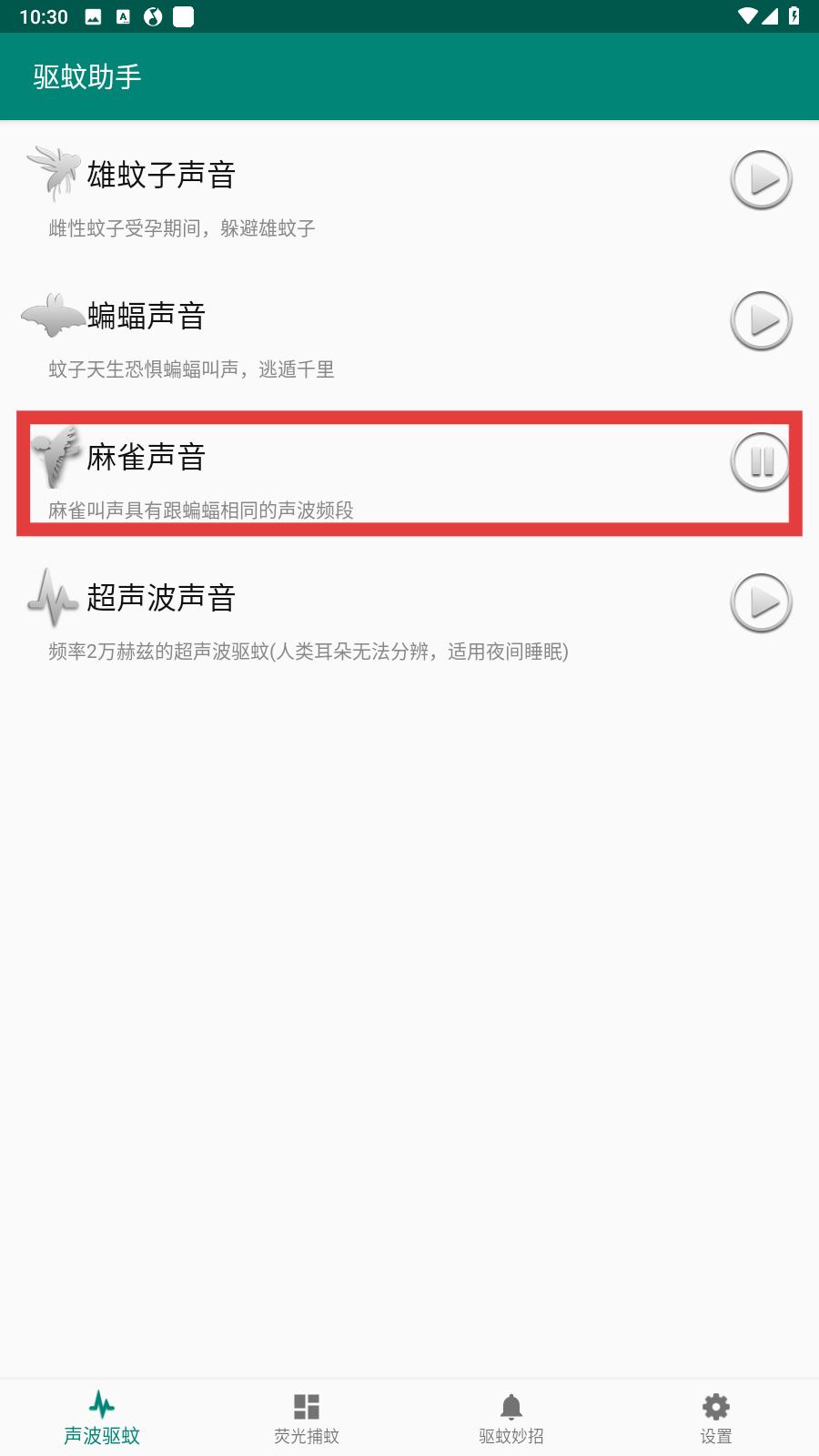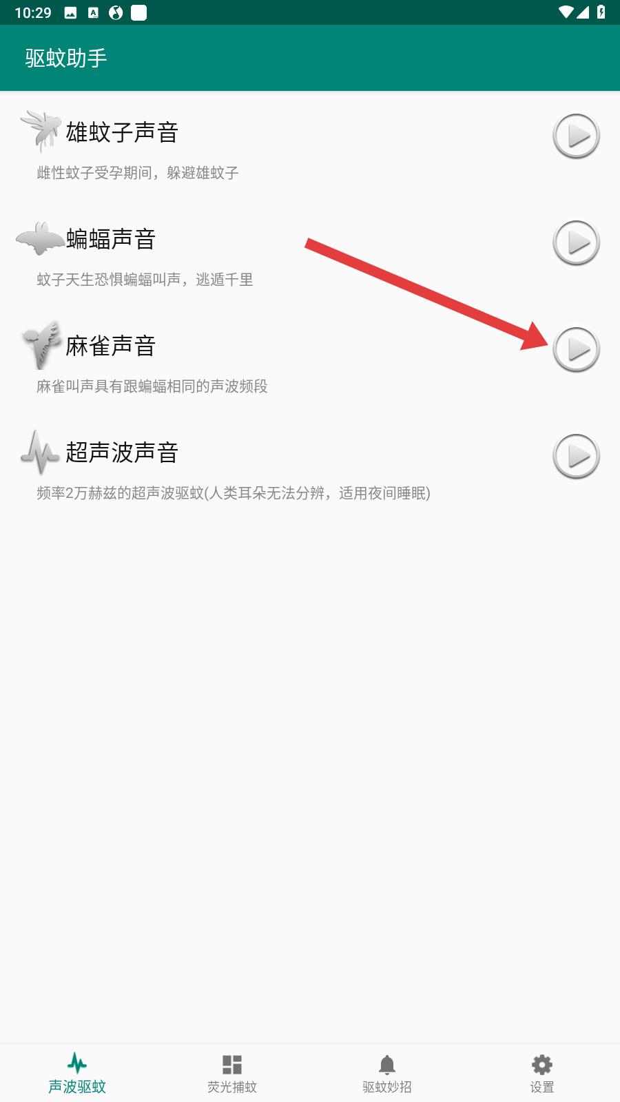 2、目前共有雄蚊子声音、蝙蝠声音、麻雀声音、超声波四种,大家都可以播放试试
