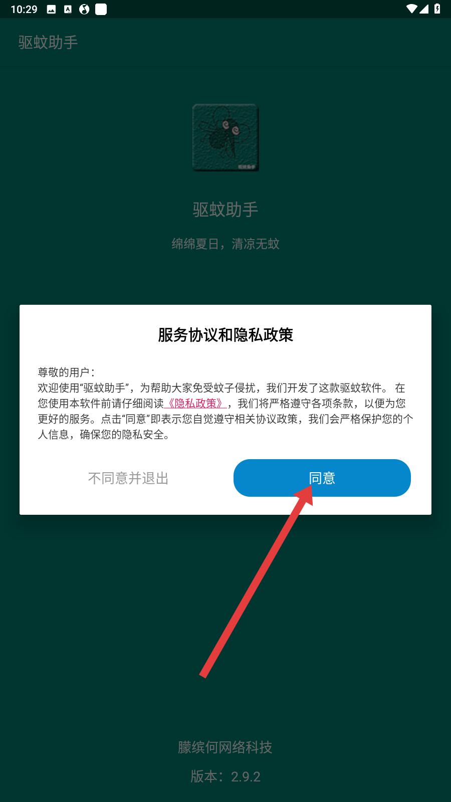 1、打开驱蚊助手,弹出服务协议和隐私政策弹窗,点击同意,进入软件主界面,准备使用驱蚊功能。