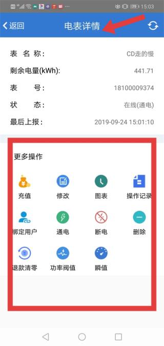 2、辰域智控平台电表详情页面,展示电表基础信息,更多操作区提供充值、断电等功能,方便用电管理。