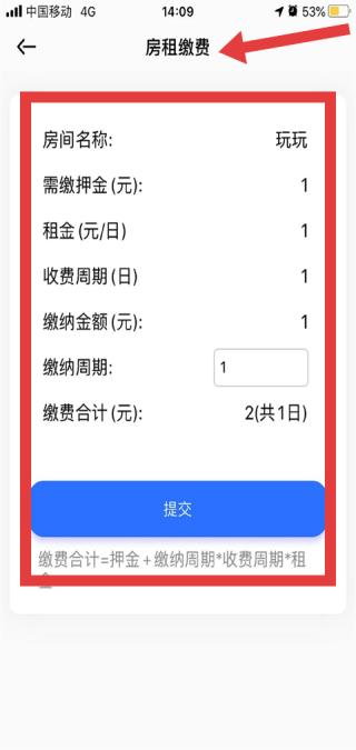 3、辰域智控平台APP的房租缴费页面,呈现房间费用明细,需填写缴纳周期,点击提交完成缴费,操作便捷。