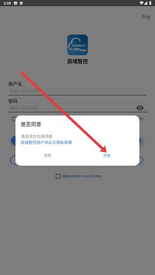 1、辰域智控APP登录界面,弹出协议确认弹窗,勾选并点击同意,才可继续登录,保障用户知情权。