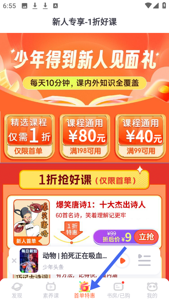 3、首单特惠页面少年得到新人福利多,精选课程1折,含爆笑唐诗1等,还有满减券每天10分钟覆盖课内外知识。