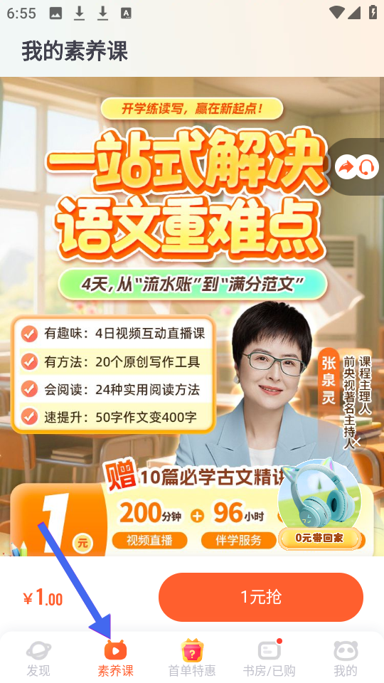 2、素养课页面主推语文重难点课程,张泉灵主讲4日视频互动直播,赠古文精讲伴学服务加持仅需1元抢购。