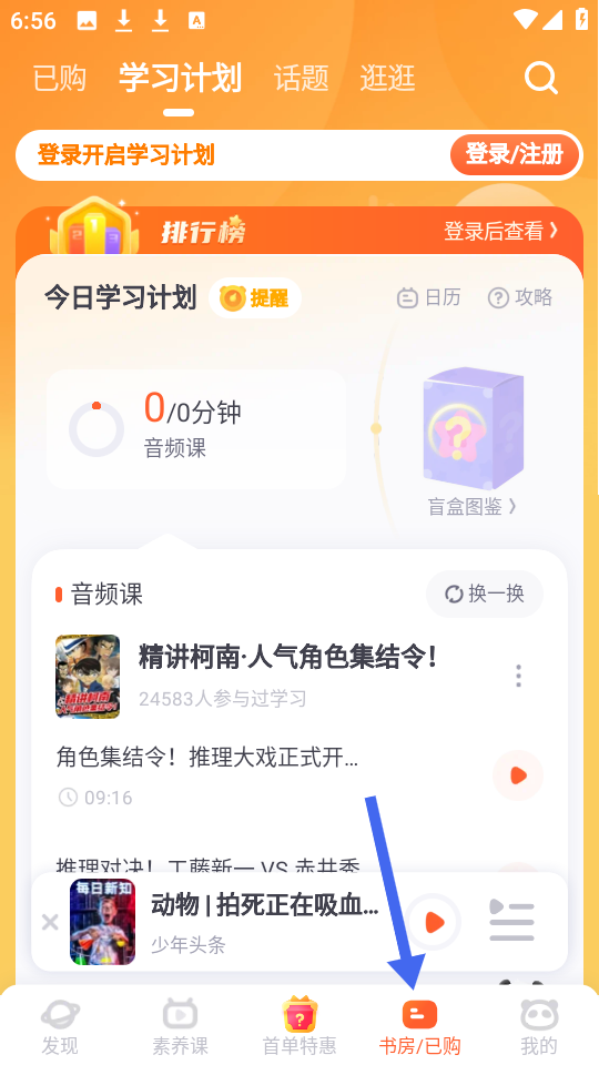 4、书房已购页面展示学习计划等,有音频课如精讲柯南,显示参与人数,登录后可查看排行榜开启个性化学习。