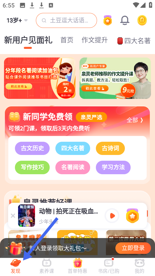 1、点发现新用户见面礼页面,为13岁用户准备,有分年龄段名著加油包、泉灵推荐作文课等特惠,还可免费领2门课涵盖多科目。