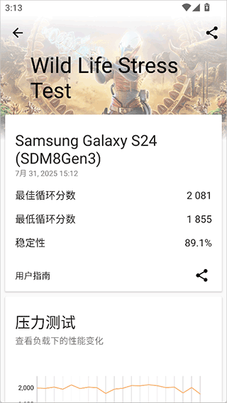 其在手机端上的操作是进入app中切换至Wild Life Stress Test界面下进行测试启动,测试时点击右侧的下载图标