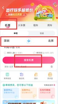 1、打开无忧行APP,在首页导航栏选定机票选项卡,于出发地、目的地输入框依次准确录入深圳、北京,点击搜索机票按钮,即可进入机票查询预订流程。
