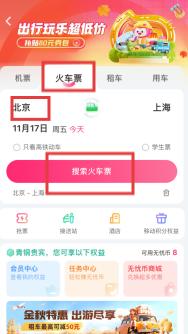 2、进入无忧行APP界面,在顶部功能区切换至火车票标签,分别在出发地、到达地栏填写北京、上海,点击搜索火车票,开展车票查询及预订。