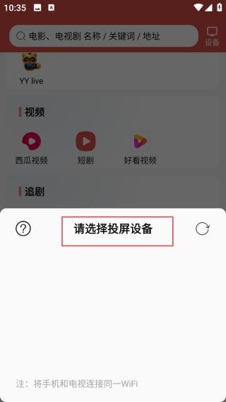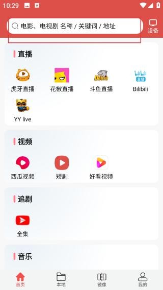 1、首页顶部设有搜索栏,可输入电影、电视剧名称、关键词或地址,右侧有设备选项。