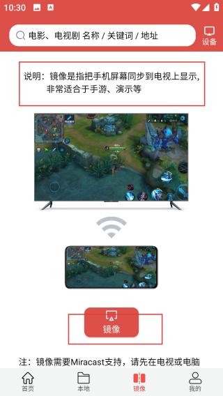 2、下方展示手机与电视画面同步的示意图,并有红色镜像按钮,点击可进行镜像投屏操作。