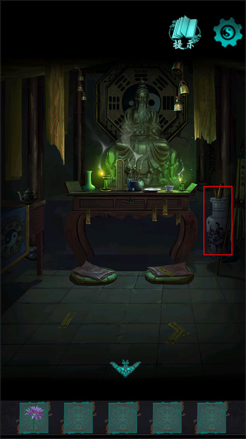 6、在花瓶里查看到相应的信息,需要集齐香、花、灯、水、果五种东西,供奉桌上已经有香、灯、水三种,你需要找到剩下的两种物品。