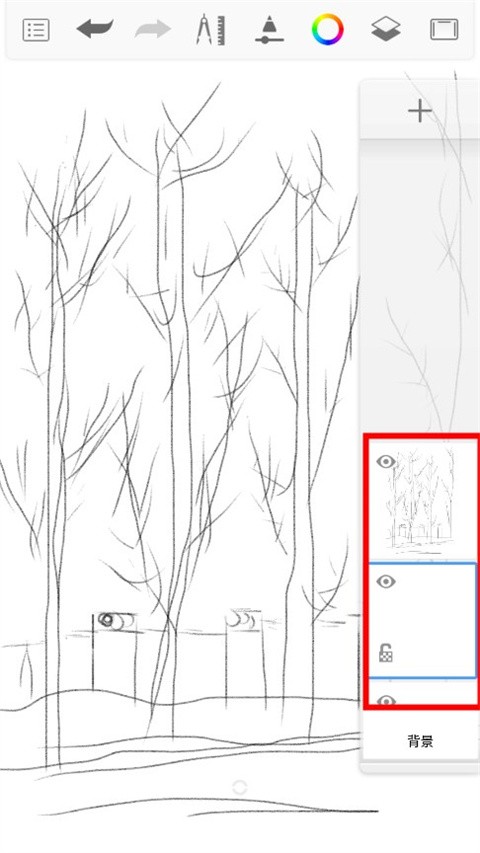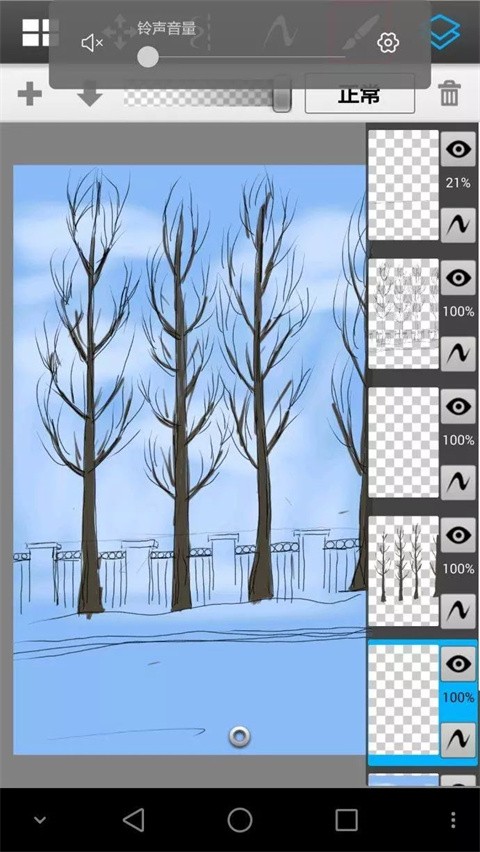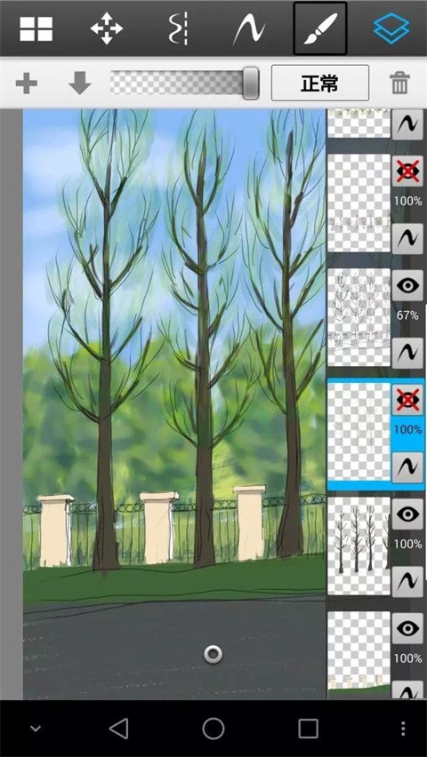 尽量多的按照类别分图层,但是这个软件手机版只有16个图层,把刚才的远树从新用喷笔画模糊了些,近树树叶透明然后下面介绍另外一种笔加细节