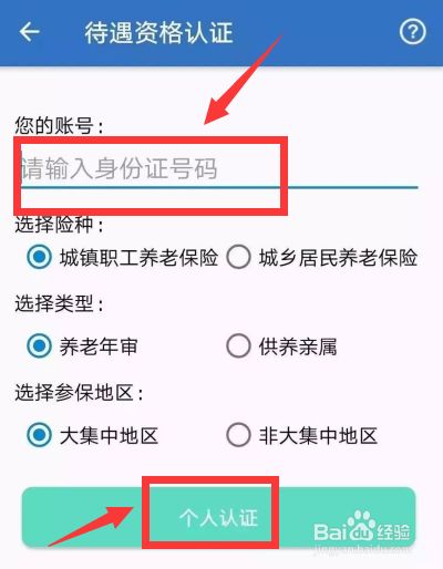 输入身份证号,选择险种和参保地区,点击“个人认证”。