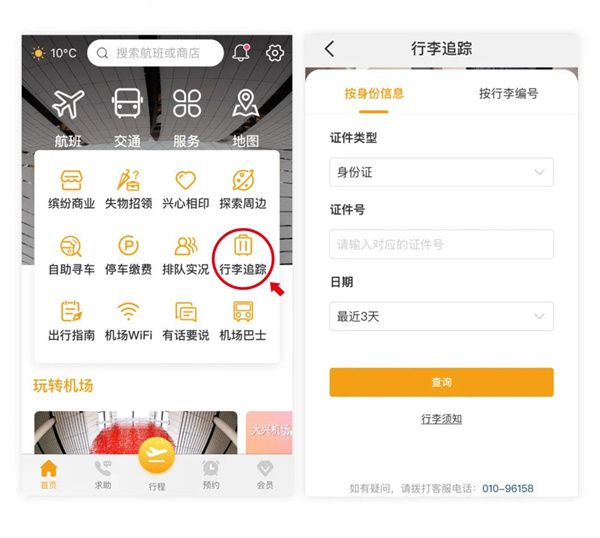 进入"行李追踪",可通过身份证号或行李编号查询进出港行李实时状态