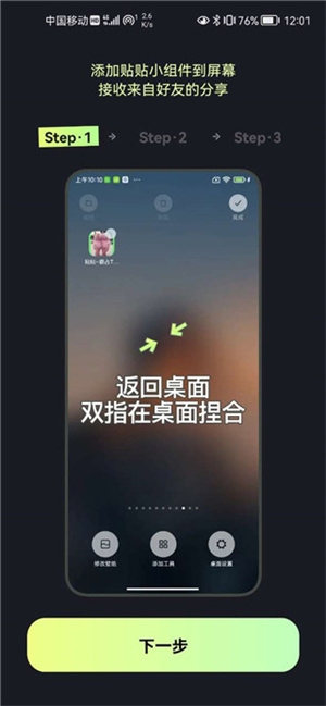 3、然后这里有使用方法,双指在桌面捏合,返回桌面,添加贴贴小组件到屏幕,接收来自好友的分享。