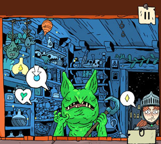 学会制作药水之后,接下来玩家便可开启商店完成营业了,记住来到这里的每个客户都有特殊的订单,其中上面的文字泡泡显示了它想要的药水原料,你必须至少使用1张客户想要的配料卡,否则游戏结束,
