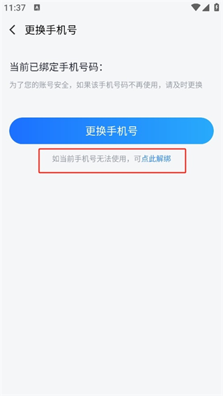 3、然后在更换手机号下方,点击“若当前手机无法使用,可点此解绑”。