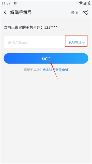 4、最后,点击获取验证码并完成填写即可解除绑定的手机号。