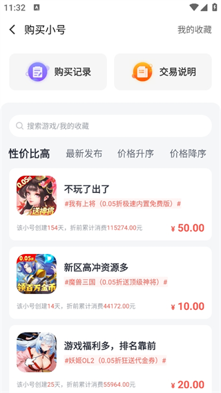4、例如点击:购买,就可以看到很多其他玩家最新发布的信息、区服以及价格。