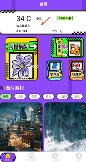 1、选择你们的城市可以查看天气,还可以拥有各种不同的海报模版。