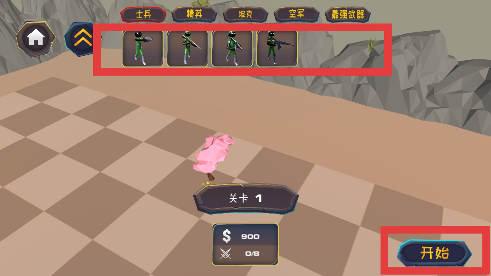4、在战前配置界面,从士兵等分类中挑选兵种如绿色持枪士兵,搭配出战阵容,确认后点击开始,进入关卡战斗,运用兵种特性克敌制胜。