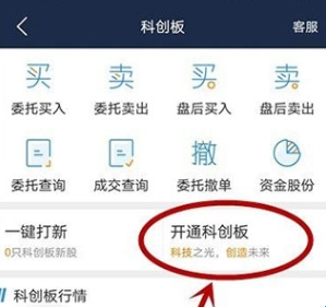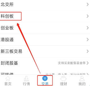 3、点击菜单下方的“交易”,进入后,在点击页面中部的“科创板”。